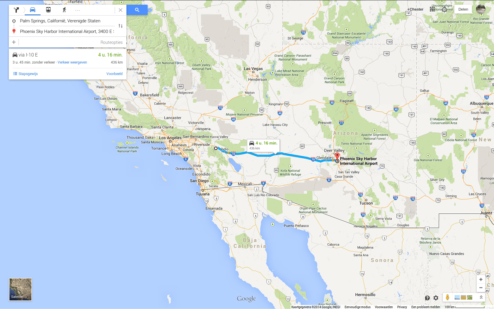 Het was intussen al 39 graden, deze dag bereikten we ons record van 104 graden Fahrenheit, wat precies 40 graden Celsius is. Lunchen deden we bij Del Taco in Blythe, om 16.00 uur kwamen we in Phoenix Sky Harbor aan om onze auto bij Hertz in te leveren. Dat kostte maar een paar minuten, met de shuttle bus moesten we naar het vliegveld, het vliegtuig vertrok om 19.40 uur.